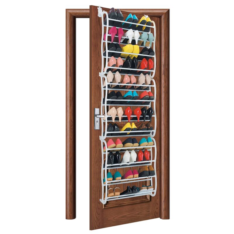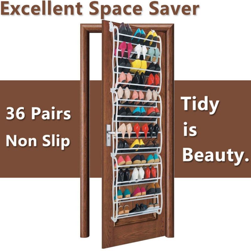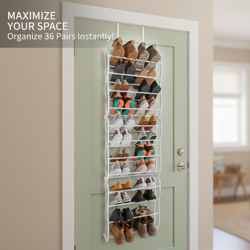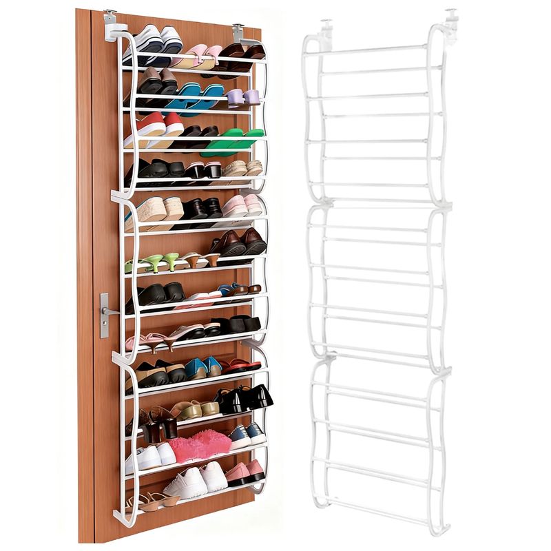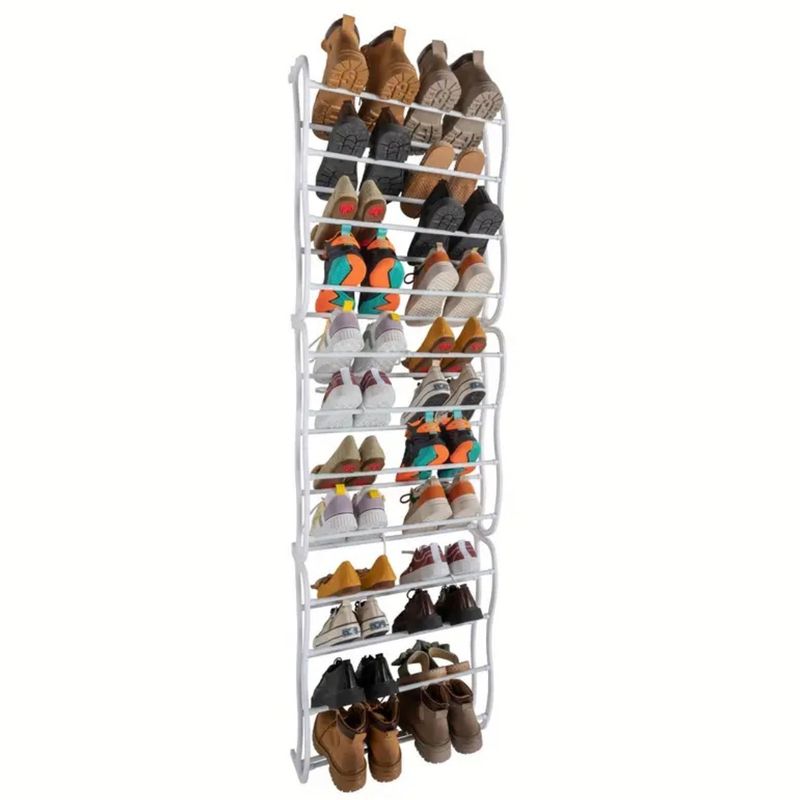 Zapatero colgante de gran capacidad, diseñado para aprovechar al máximo el espacio vertical instalándose directamente sobre puertas o fijándose a la pared. Su estructura metálica en color blanco ofrece una solución de almacenamiento organizada, resistente y discreta, ideal para dormitorios, vestidores, cuartos de servicio o apartamentos con espacio limitado.