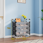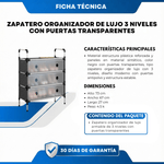 Material estructura plástica firme y paneles sintéticos, color negro con puertas transparentes, tipo zapatero organizador de lujo de 3 niveles, diseño moderno y estable.