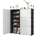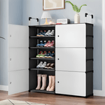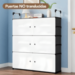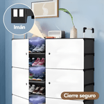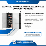 Material tela reforzada con estructura plástica resistente, color negro con puertas claras, tipo zapatero organizador armable 2 columnas x 5 niveles, diseño modular con puertas antipolvo, estructura ligera y estable.