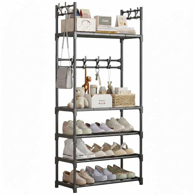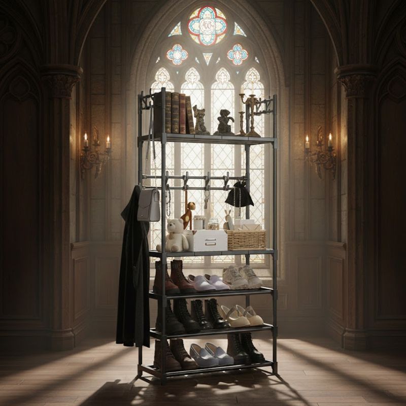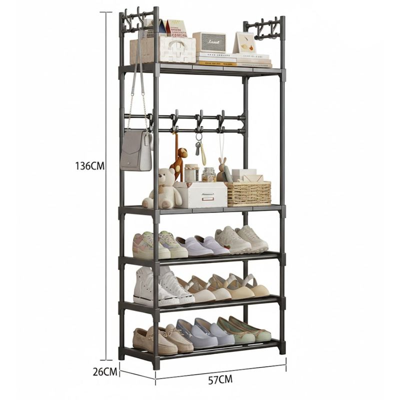Perchero organizador multifuncional de 5 niveles, diseñado para optimizar espacios pequeños como entradas, pasillos o dormitorios. Su estructura combina de forma eficiente almacenamiento para calzado, repisas para objetos personales y ganchos para accesorios, permitiendo mantener todo en orden desde el primer momento en que llegas a casa.