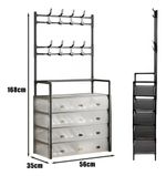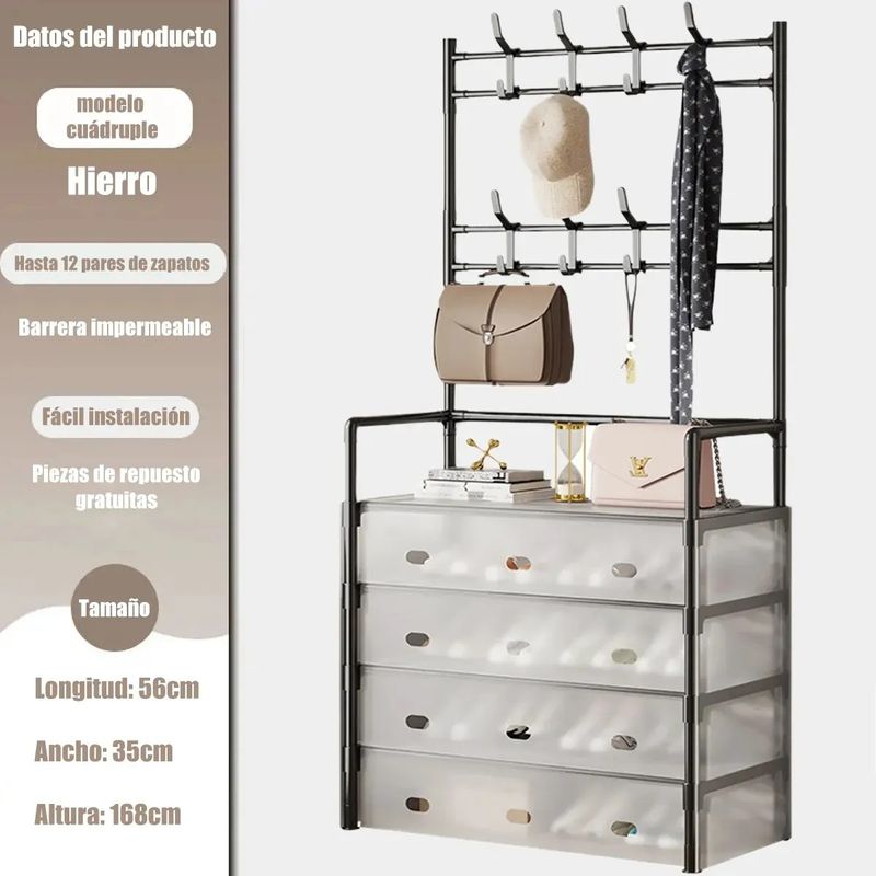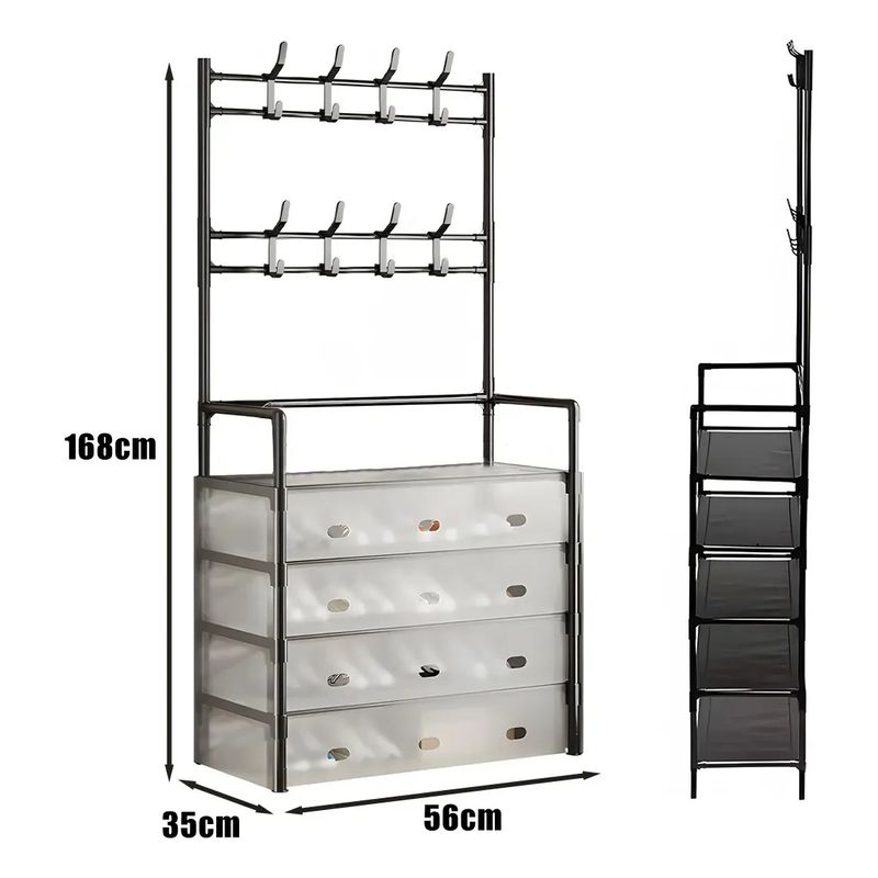 Diseñado para optimizar el almacenamiento, este perchero zapatero con tapa mide 35 x 57 x 168 cm y está fabricado en metal, lo que garantiza durabilidad y resistencia.